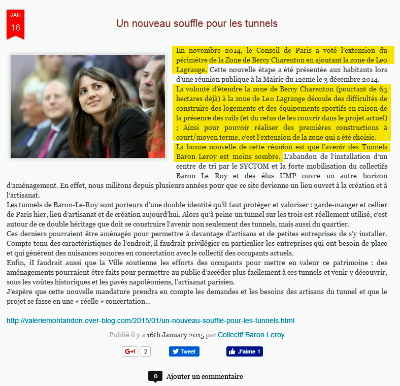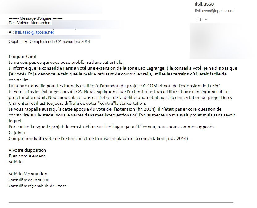 Le document retrouvé et mis en ligne par IFSLL dans l’article précédent a été écrit de la main de Valérie Montandon. Il stipule noir sur blanc (et surligné en jaune par IFSLL) que « La volonté d’étendre la zone de Bercy-Charenton (pourtant de 63 hectares déjà) à la zone de Léo Lagrange découle des difficultés de construire des logements et équipements sportifs en raison de la présence des rails ».
