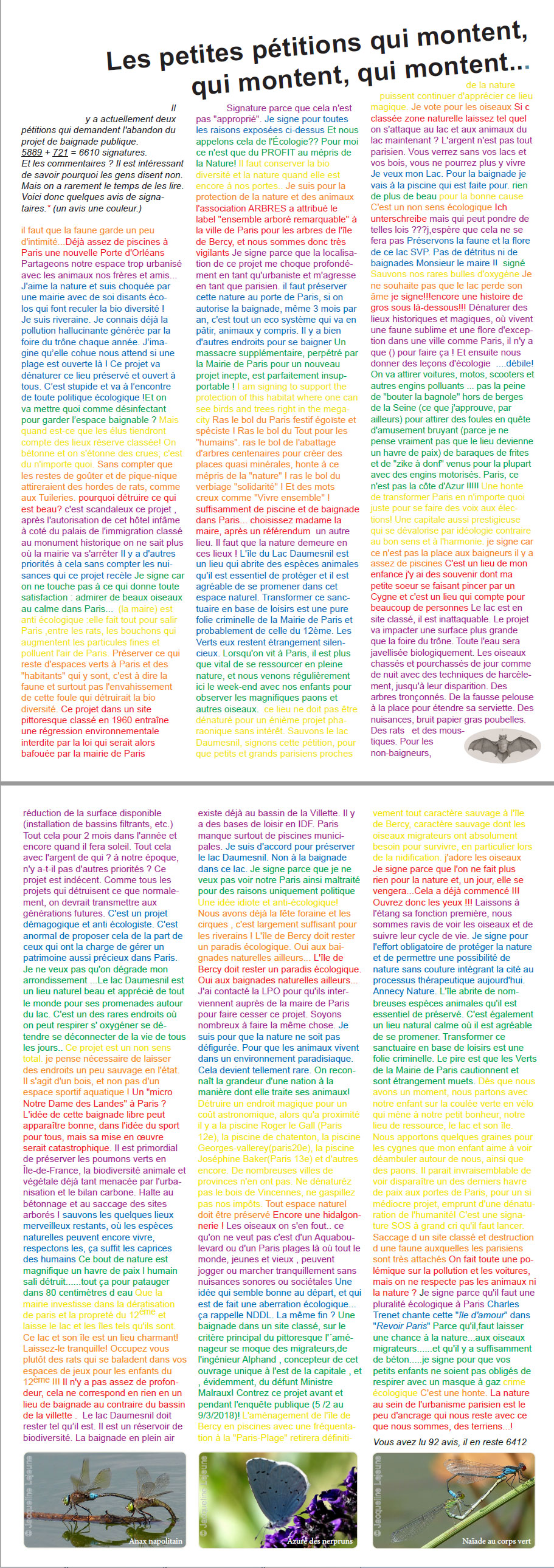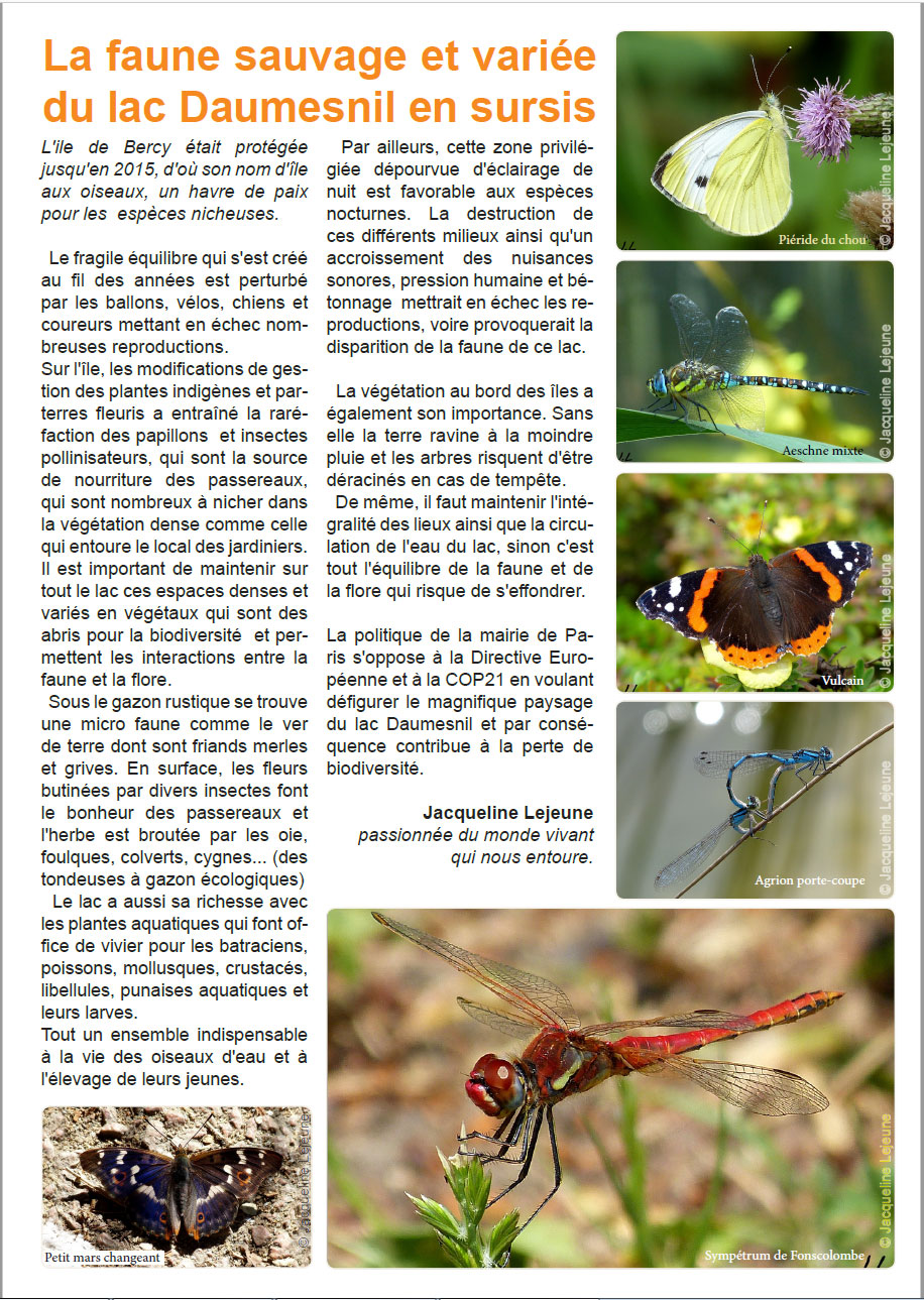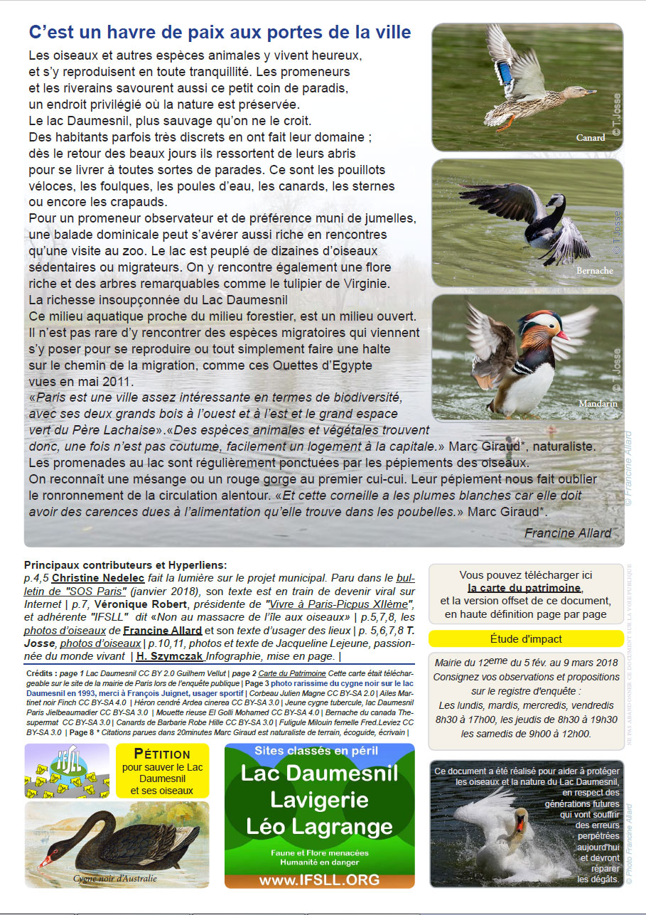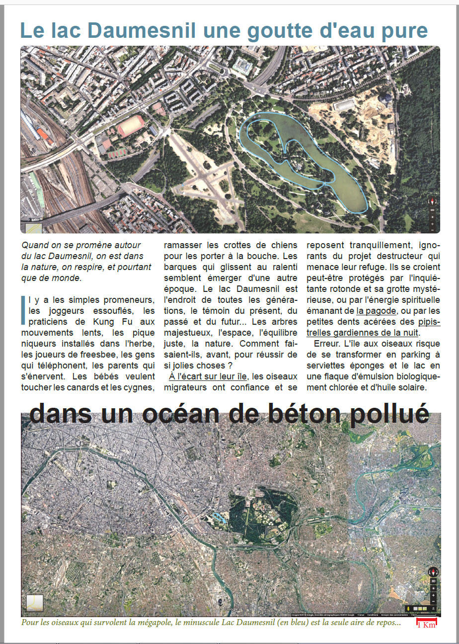Défendre le lac Daumesnil, les oiseaux et les humains de la spéculation absurde. Depuis quelques temps, les projets n’ont même plus besoin d’être intelligents mais se justifient à coup de prétextes d’utilité publique. Quoi, c’est d’utilé publique de détruire un site protégé ? Non. La seule chose qui soit d’utilité publique, c’est de défendre le lac Daumesnil. Tenir encore quelques années… Après, quand les jeunes générations auront pris le relais, le problème ne se posera plus. Au lieu d’inventer des problèmes, on inventera des solutions.
