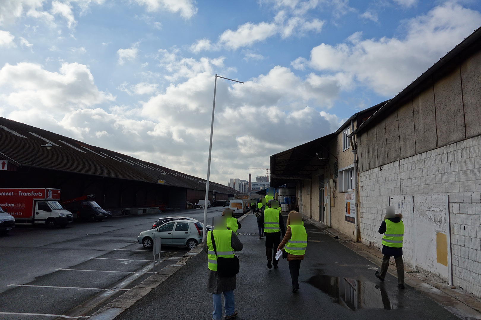 26 14 décembre 2016Pleine résolution (1620 × 1080) On s’engage direction SUD OUEST entre deux rangées d’entrepôts bas. Au loin, à 600 mètres, le quartier de l’école supérieure d’architexture, et derrière les étranges délires de l’Avenue de France