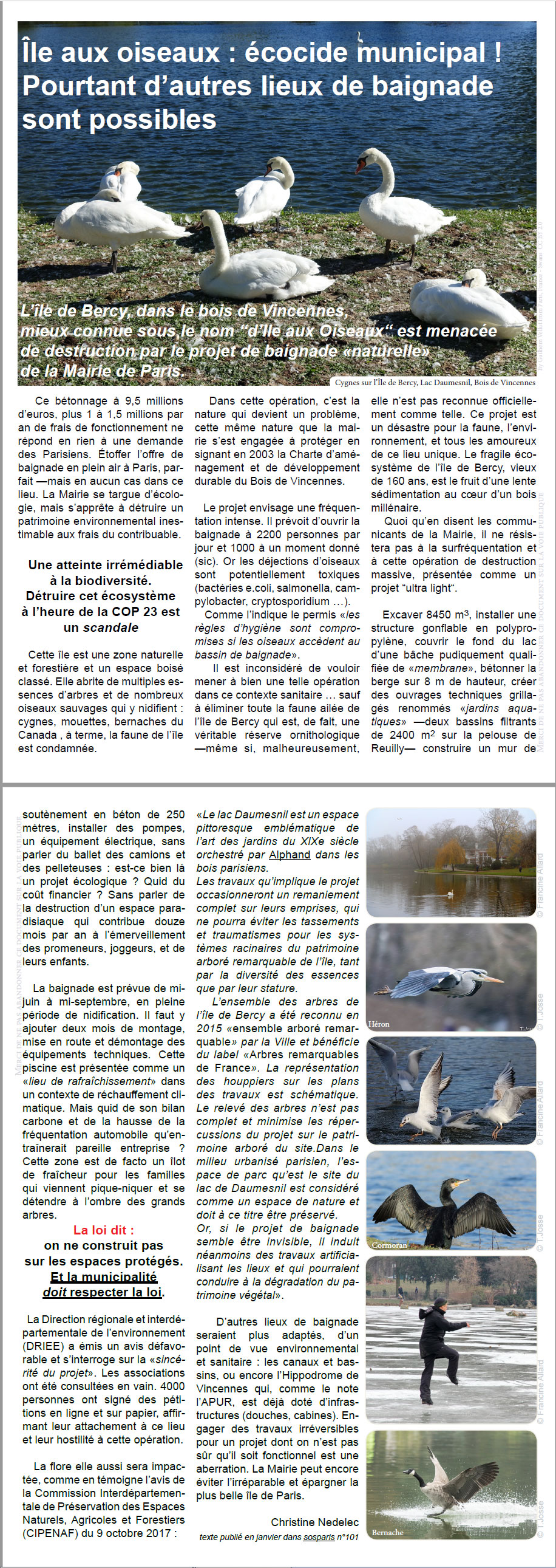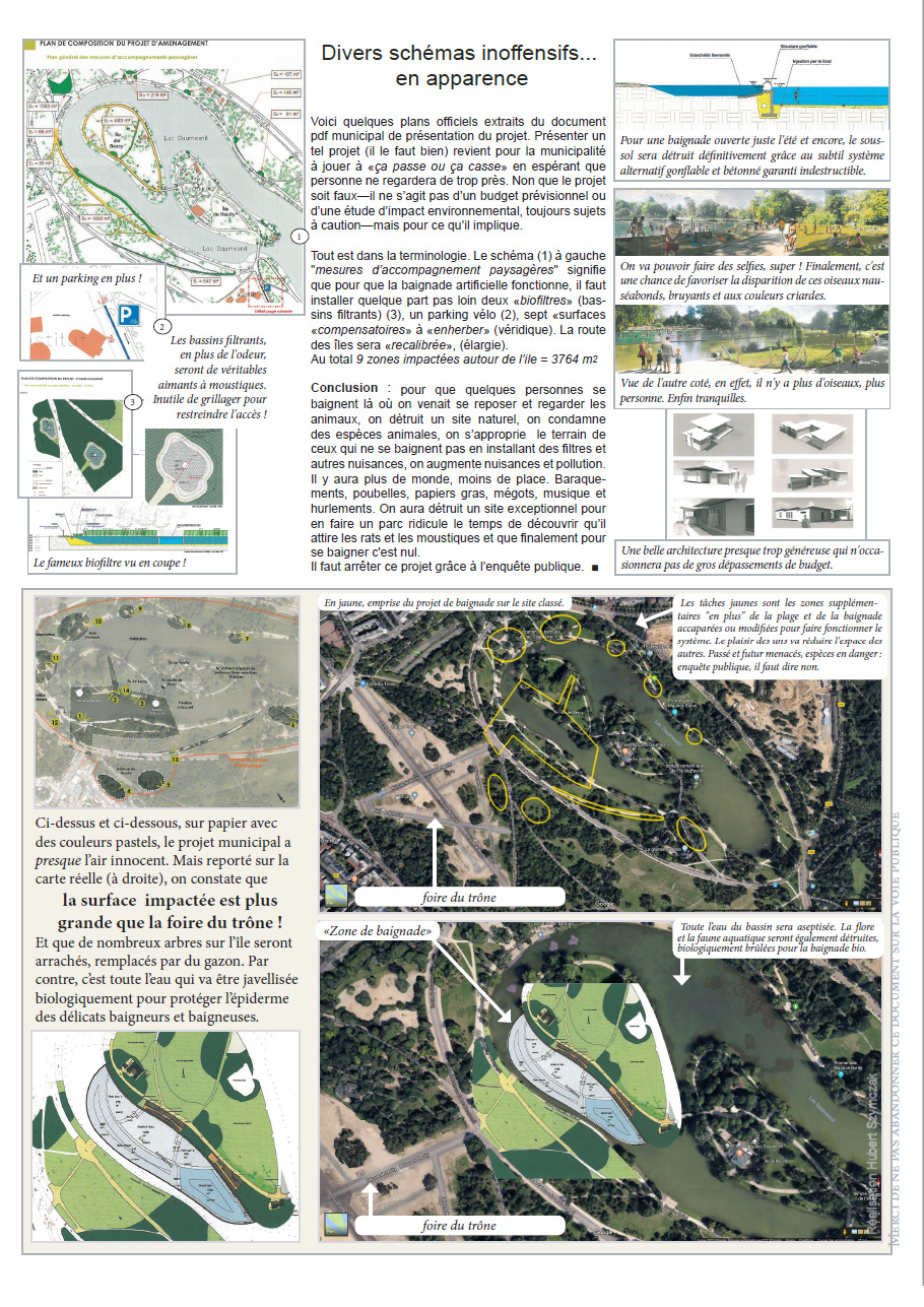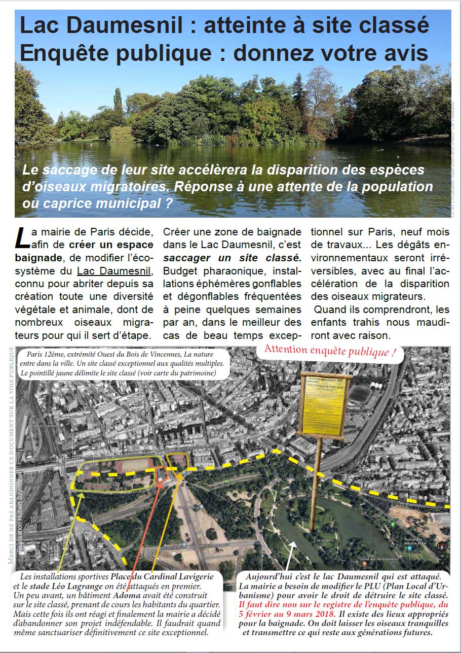 Voici un document à faire circuler. 12 pages d’argumentation pour défendre le lac Daumesnil et les animaux menacés par la municipalité. Les témoignages et avis d’habitués du Lac Daumesnil. Photographes, sportifs, promeneurs, associatifs engagés ou non dans la noble cause environnementale. Et en complément, de nombreux liens utiles pour se documenter ou agir (voir dernière page, contributeurs)