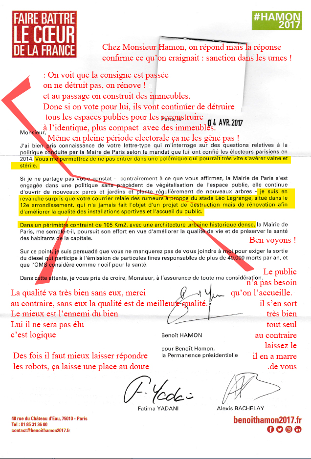 Tout est dit. Monsieur Hamon continuera la politique de destruction des espaces verts et installations sportives menée par la mairie de Paris avec l’efficacité qu’on sait. Il faut admettre que cette lettre n’a pas été écrite par un robot. Grossière erreur stratégique !!!