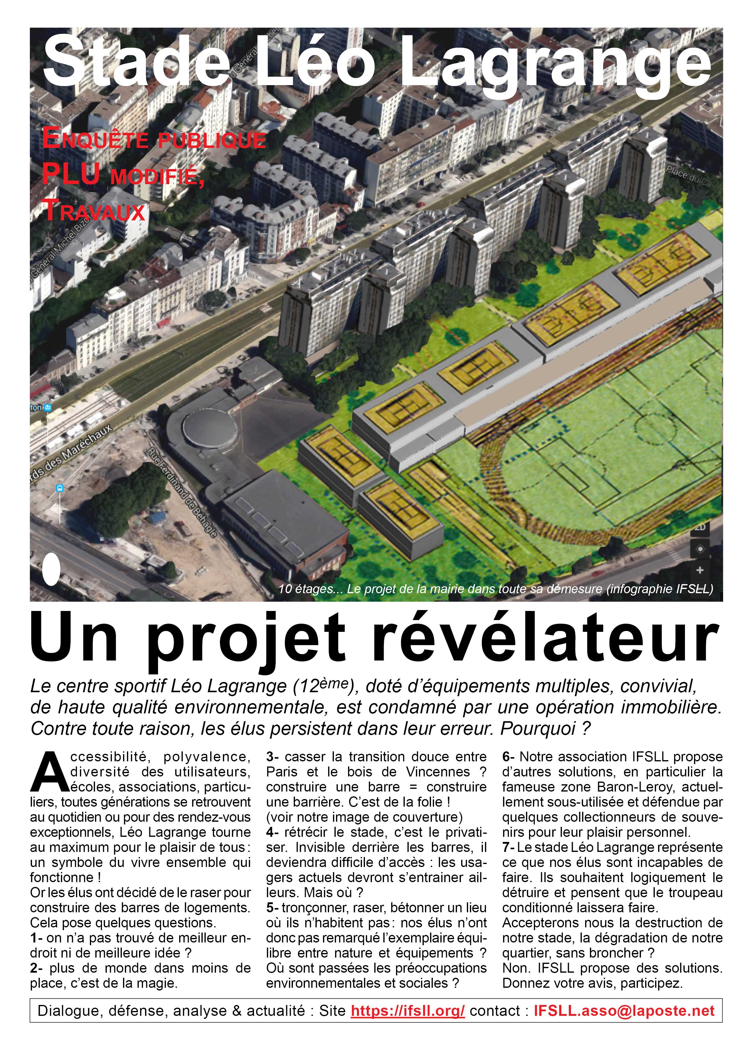 • IFSLL ne veut pas qu’on détruise le stade –la mairie s’entête à nuancer qu’il ne s’agit pas de destruction mais plutôt de… j’ai oublié le terme novlangue de substitution, qu’importe, accordons lui cette coquetterie, la nuance ne changera rien au résultat–. Quel que soit le terme choisi, à un moment donné, on constatera le complet effacement du stade Léo Lagrange actuel et son remplacement par un entassement d’équipements sportifs compactés au bord de la route des fortifications pour installer un ensemble d’immeubles montant à 31 ou 37 mètres, véritable nouveau quartier autonome le long du boulevard Poniatowski en lieu et place du terrain de foot actuel. Ce qui était évident au vu du projet et des maquettes sera confirmé : le stade sera devenu invisible, et privatif. Le nouveau quartier ne sera rien d’autre qu’un coupe gorge à éviter la nuit, comme certains coins de banlieue.