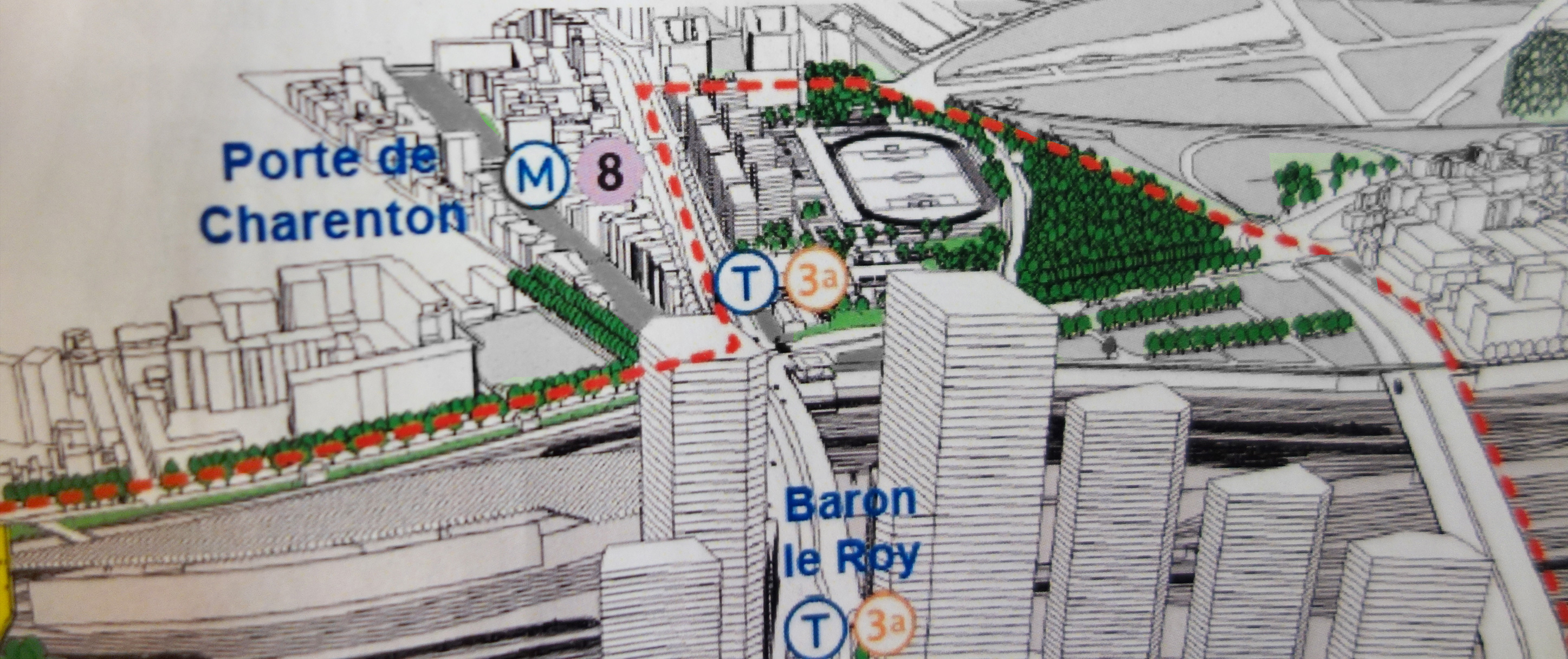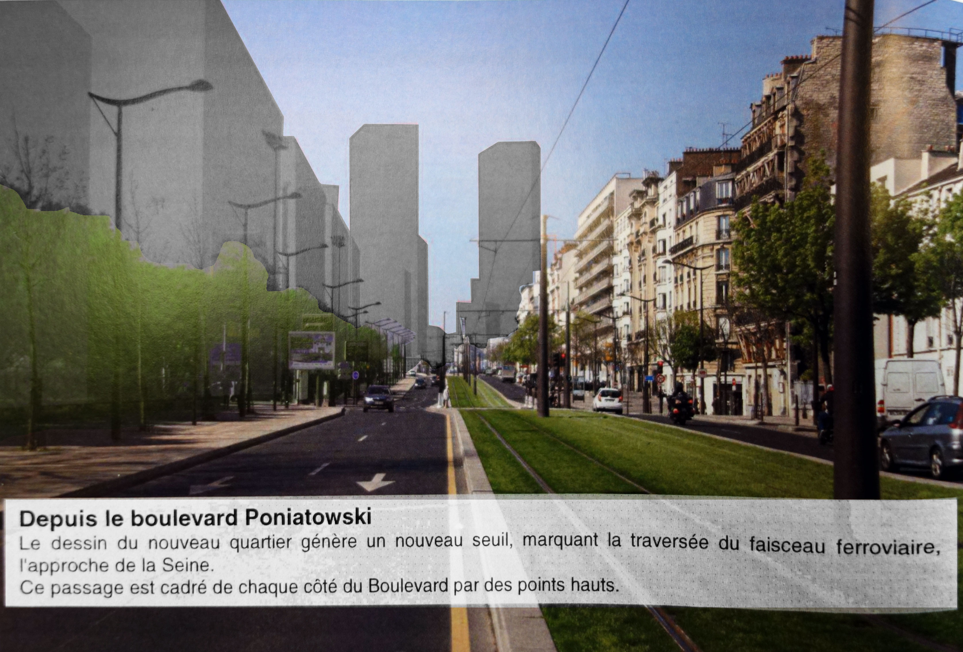 Pour réaliser ses projets, la mairie se voit contrainte de mettre en compatibilité la Zone UG (Zone Urbaine Générale) avec la déclaration de projet secteur Bercy-Charenton. L’emplacement des barres construites le long du boulevard Poniatowski, à la place du terrain de football et des terrains de basket, est colorisé en vert foncé. Or selon la légende, vert foncé signifie : secteur de mise en valeur du végétal. C’est quoi la logique ? Là où on veut construire des barres, on fait une proposition pour passer en « secteur de mise en valeur du végétal ».
