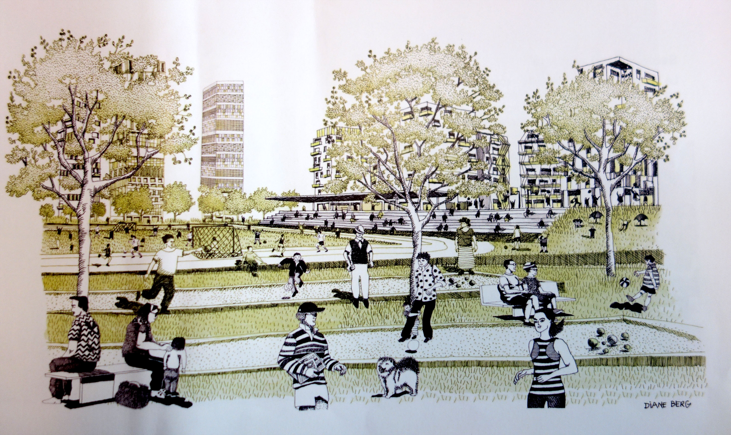 IFSLL propose déjà comme préalable la couverture partielle de la saignée ferroviaire. Cet effort financier considérable est d’ores et déjà modéré (recettes en atténuation de dépenses) par l’économie réalisée par la non destruction du stade Léo Lagrange et son inclusion complète et définitive dans la Carte du Patrimoine naturel et Sites classés . De son coté la riche commune de Charenton-le-Pont aura toute latitude pour contribuer généreusement au projet qui l’intéresse. Après tout c’est elle qui a exprimé le désir de se rapprocher de Bercy. IFSLL propose pour sa part une visualisation généreuse de ce rapprochement. Les îlots de bâtiments, non représentés sur cette vue, s’ils sont intelligents (donc si le projet est si bien pensé que la population accepte) deviennent moins utopiques. On est dans le réel, dans la réalisation du projet. Charenton-le-Pont devient plus proche de Bercy. Comme quoi détruire le stade Léo Lagrange relève d’une autre volonté que désenclaver Charenton/Bercy