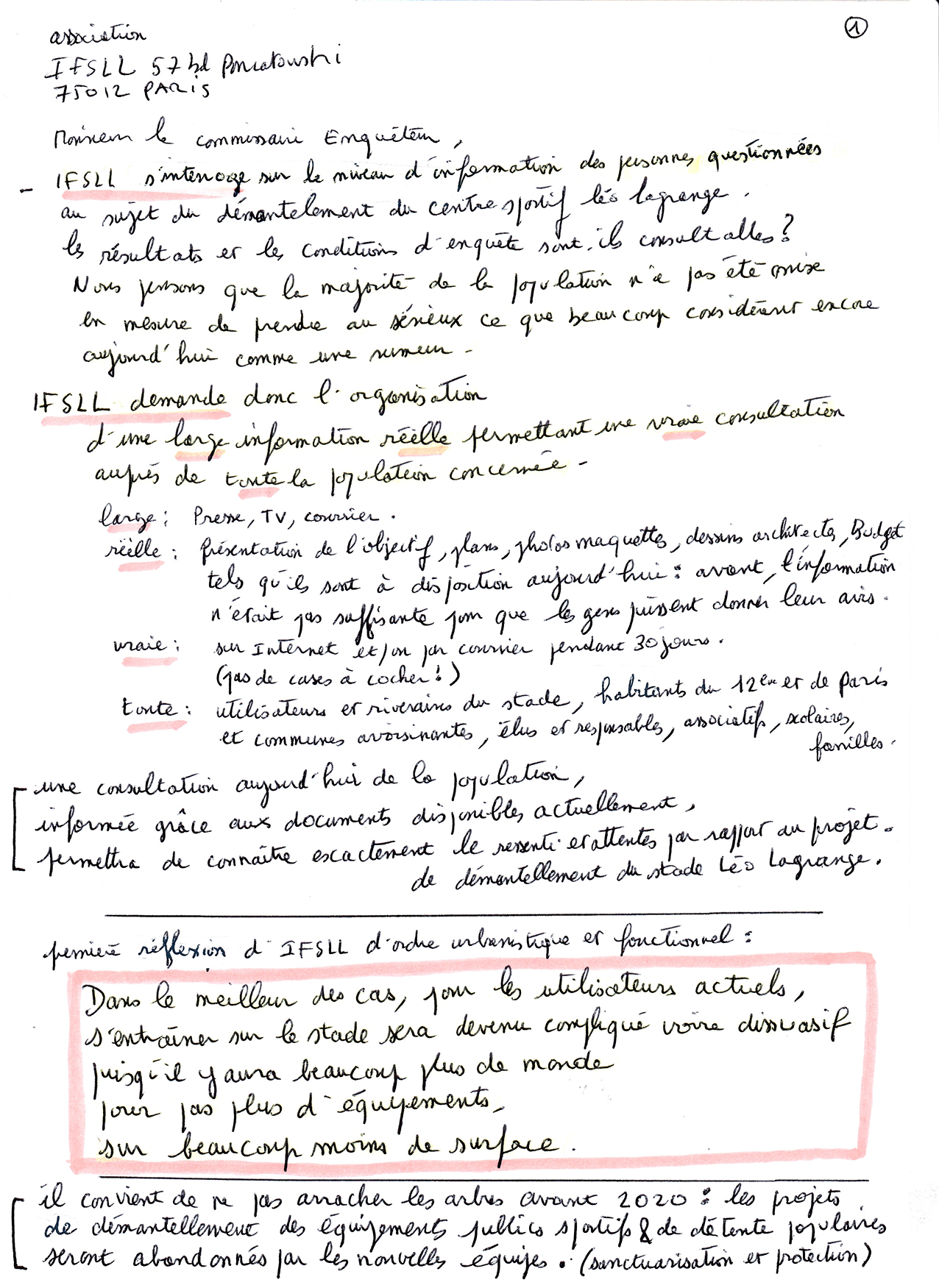 Dans  l’attente, IFSLL demande l’organisation, afin de ne pas commettre l’irréparable avant les échéances de 2017 et 2020 suites auxquelles le projet pourrait bien être ajourné, d’une large* information réelle* permettant une vraie*** consultation auprès de toute**** la population concernée.