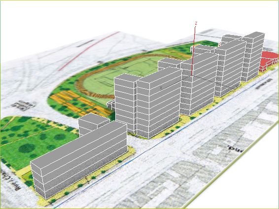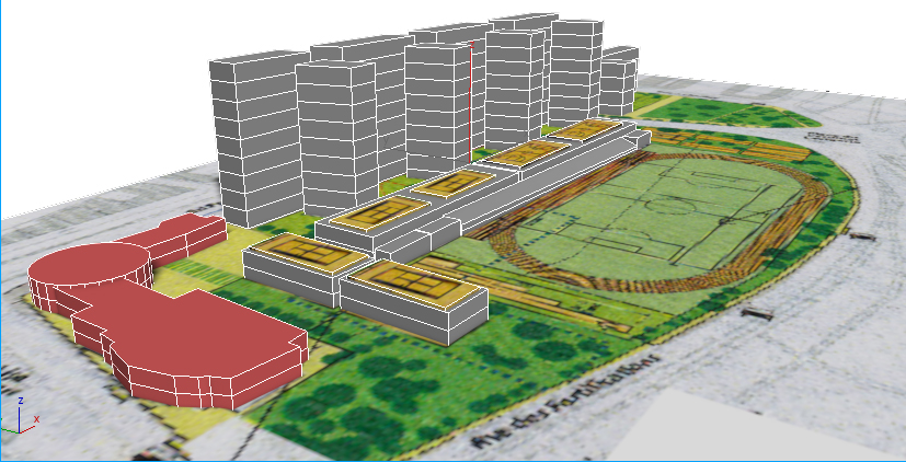 > Pour le stade lui-même (25.000 m2), 357 logements sont prévus avec 2,3 habitants en moyenne par logement (environ 822 habitants!) dont 60% de logements sociaux, 20% de logements intermédiaires et 20% qui seraient vendus à prix normal si preneurs.