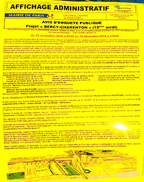 Le dossier d’enquête est consultable sur place en mairie tous les jours de 8h30 à 17h, le jeudi 19h30 en plus des permanences (Le dossier « Note de Présentation » sous-dossier B1 résume tout le projet -plus accessible-) et les plans sont sur https://bercy.charenton.imaginons.paris d’après la commissaire-enquêtrice.