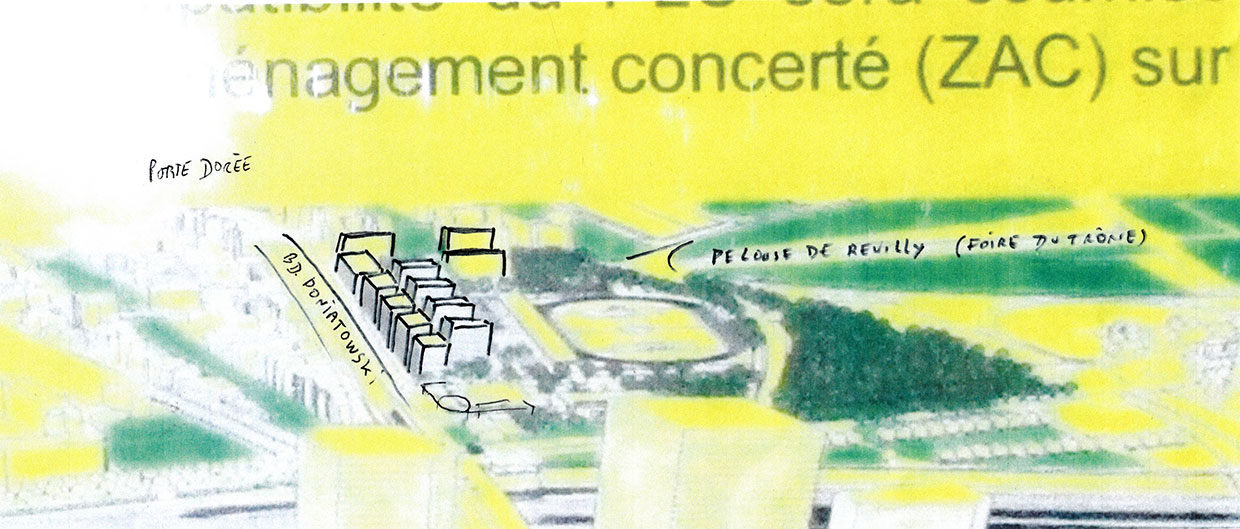 oulevard Poniatowski, on voit très bien les barres qui semblent transparentes mais ce ne sera hélas pas le cas (rusés jusqu’au bout !), posées à la place du terrain de foot, le long du Boulevard Poniatowski. Et quand on localise la route des fortifications, derrière, on comprend qu’il n’y aura pas beaucoup de place « entre », pour y loger (outre le terrain de foot) tout ce que la mairie prétend y loger. Arbres, piscine, tribune géante, patinoire, clubs house, terrains en plus, etc.