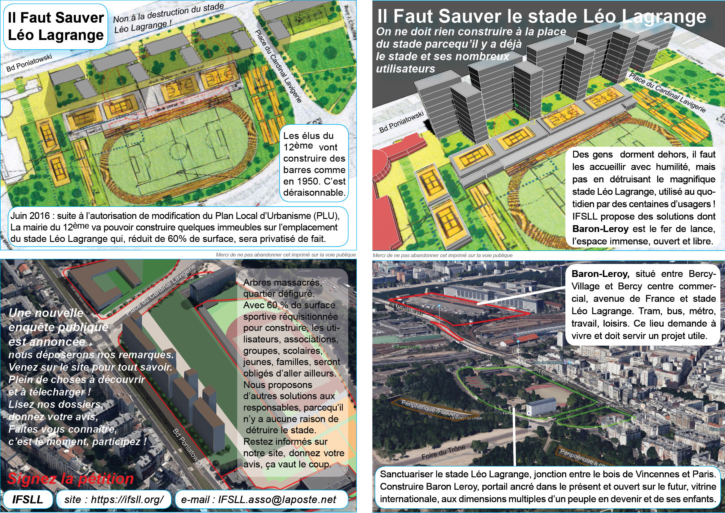Ce qu’il faut savoir : nos élus nous mettent dans l’obligation de lutter pour éviter une catastrophe urbaine majeure imminente enclenchée par eux et qui a pour but de construire des immeubles à la place du Centre Sportif Léo Lagrange alors que la solution intelligente est d’utiliser le site Baron Leroy/Gare de la Rapée, immense espace ouvert disponible depuis des décennies, insalubre, oublié mais pas par tout le monde (pratiquement privatisé de fait), à proximité immédiate. L’infographie ci dessus a pour but de résumer le travail d’IFSLL, analyser le projet et évoquer la possibilité d’une solution alternative de bon sens.